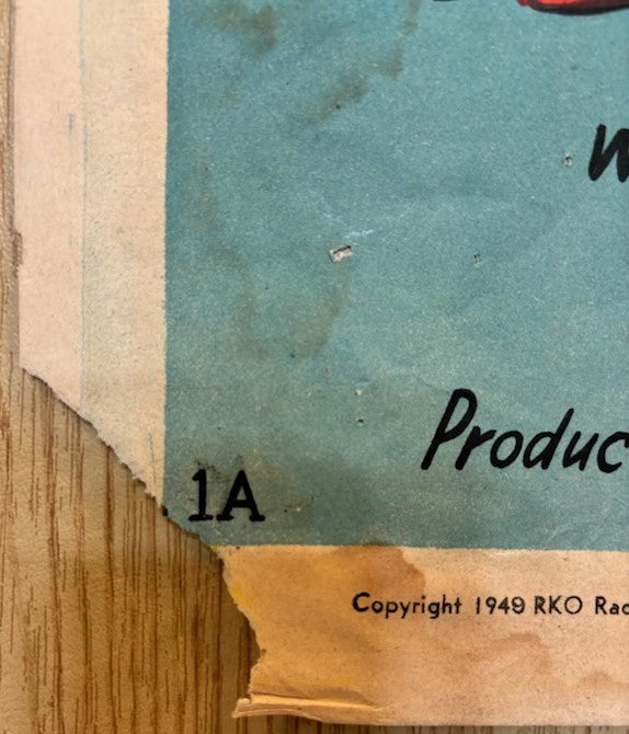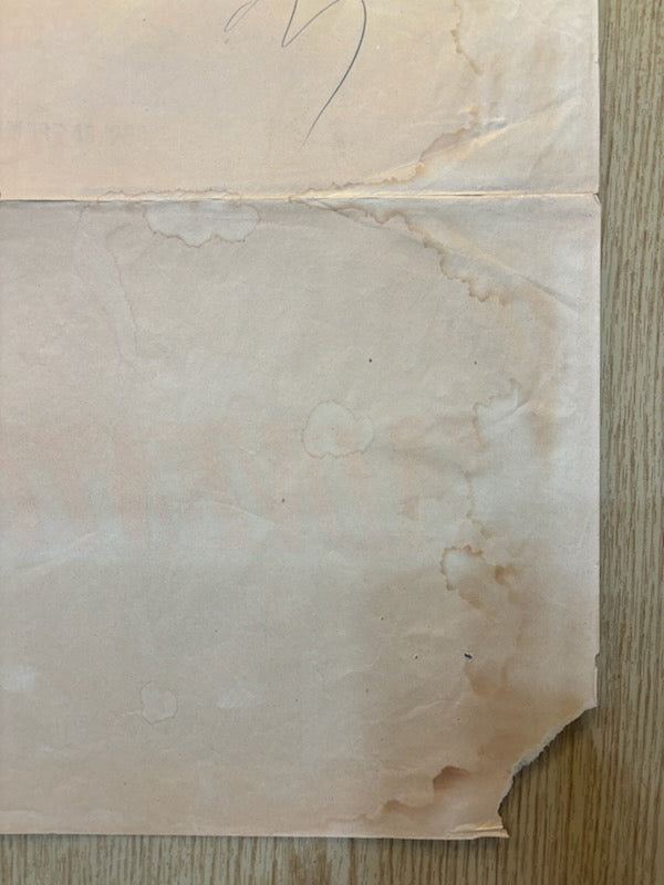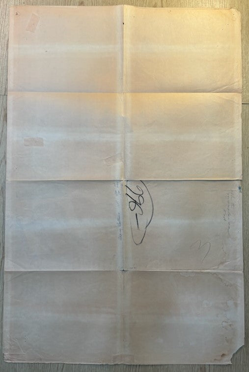 A 2 x 2" chip, 2 x 12" stain, back and front, paper darkening, some soiling, three 1" tears at folds, three 1 x 3" pieces tape on back, several 1/8" holes, pinholes