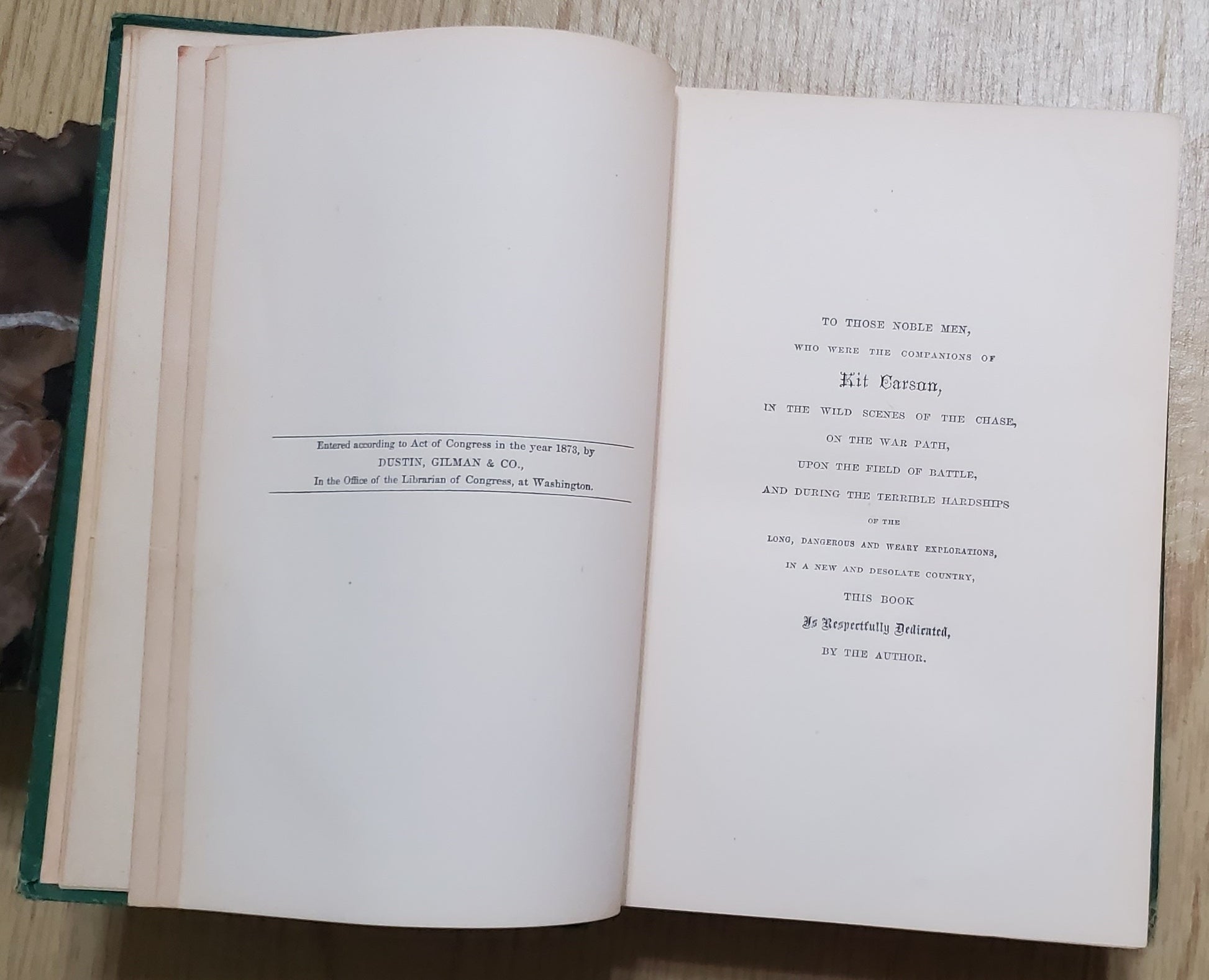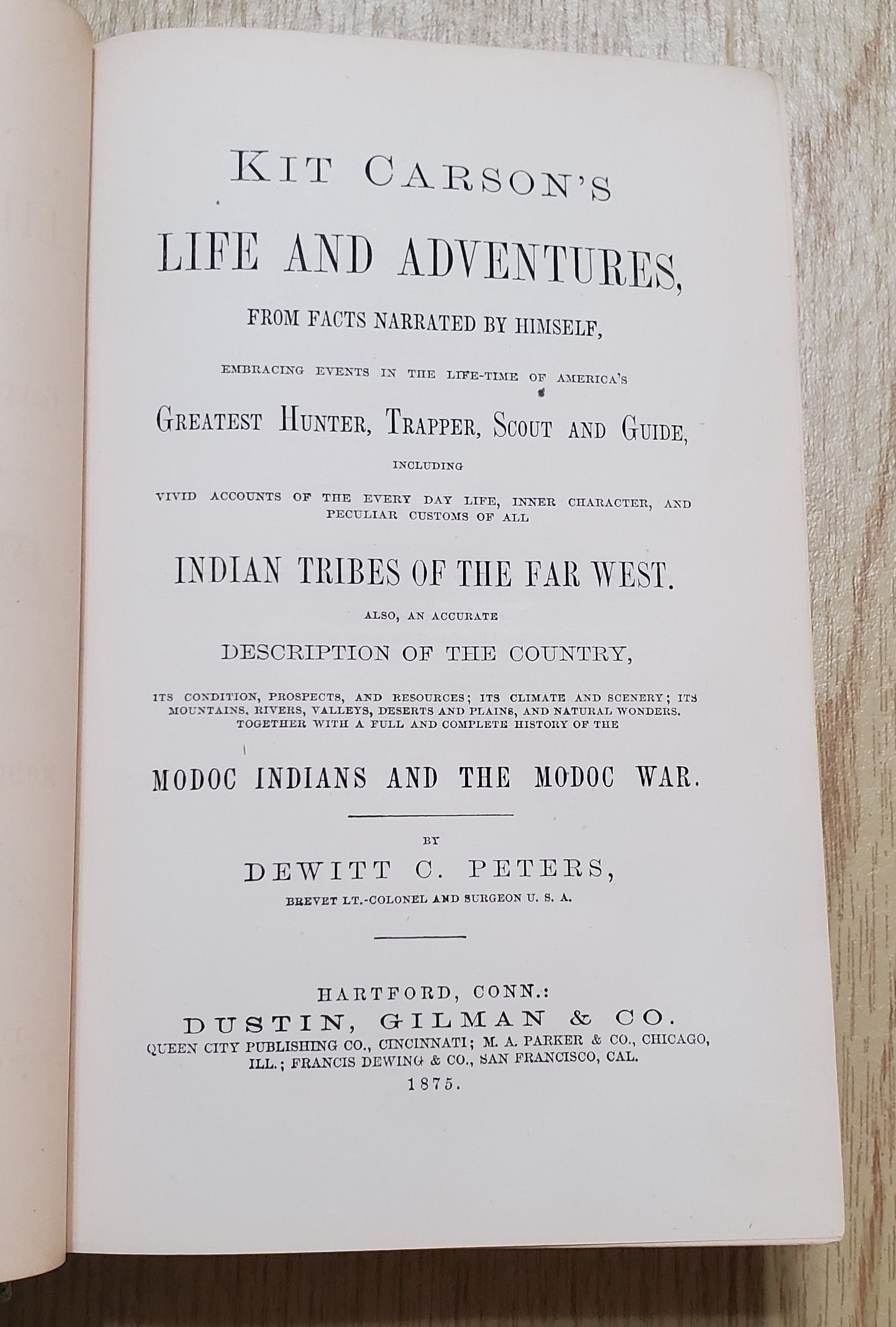 Peters, Dewit. Kit Carson’s Life and Adventures. Hartford: Dustin, Gilman, 1875.Plates. Pict cloth, gilt. VG