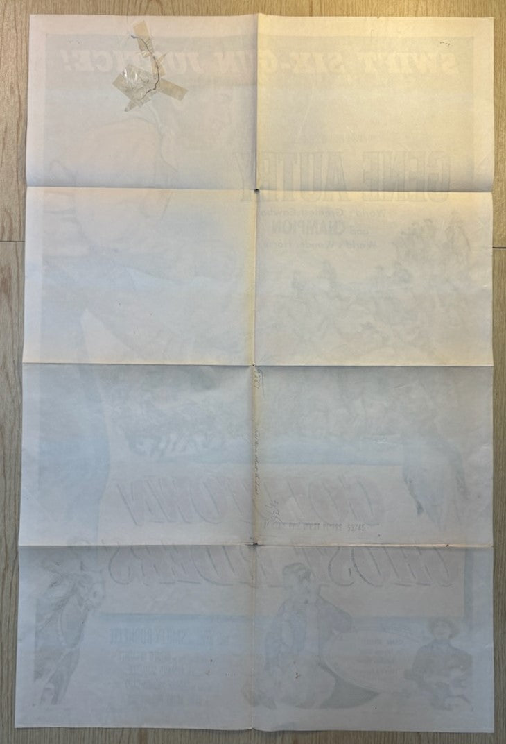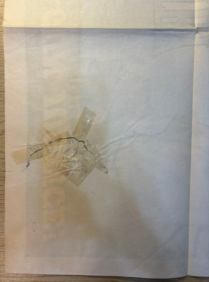 Three 2" splits at folds, 6" tear taped on back shows through on front, pinholes
