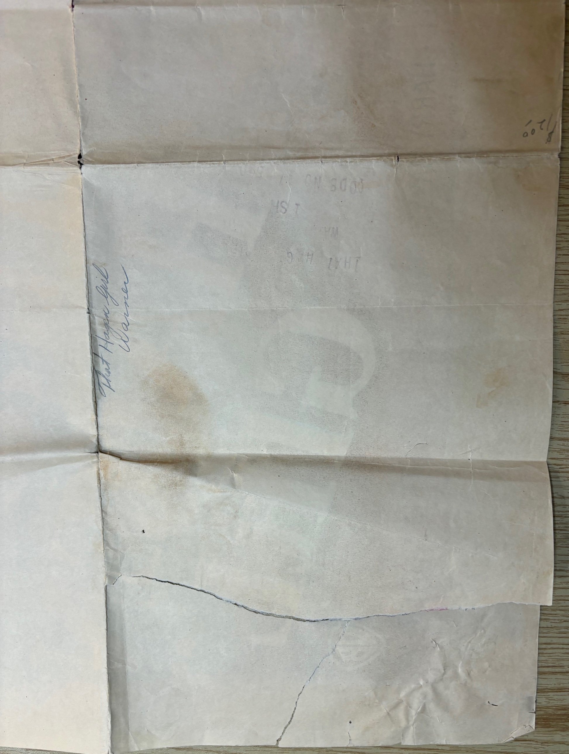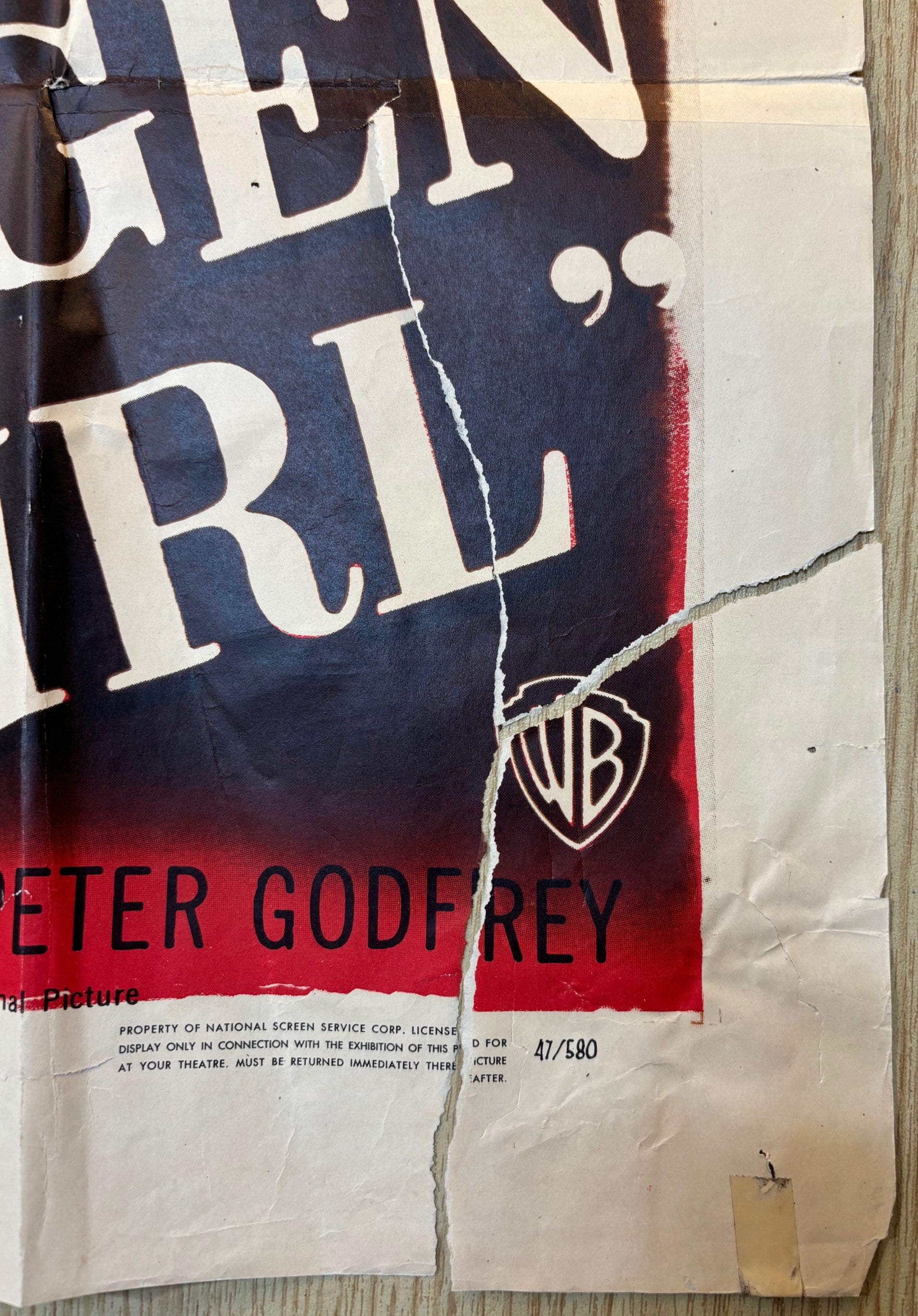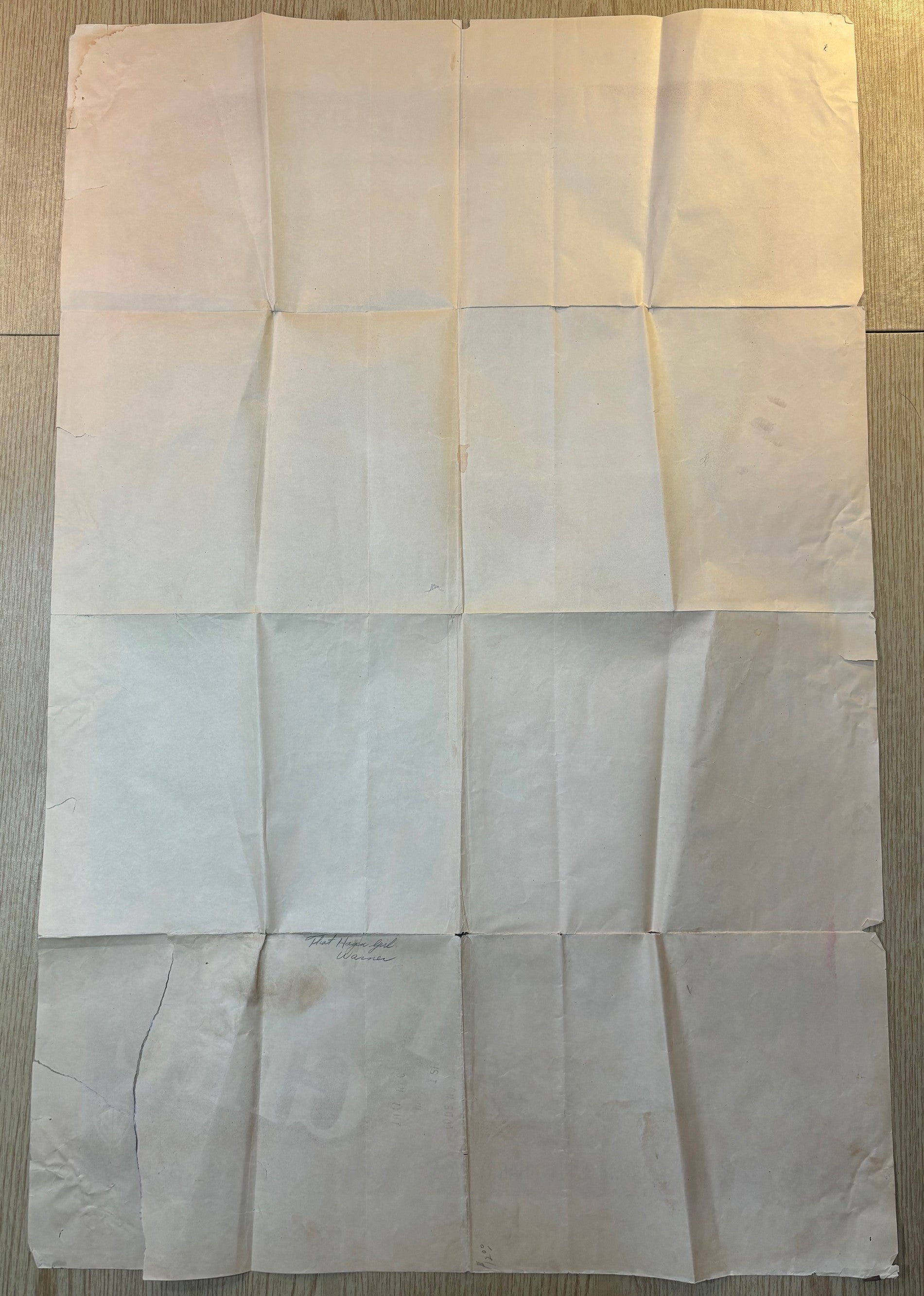 4 x 6" piece torn off (but present), 6" tear, two 1" tears, 1/2 x 1" tape on back of each corner, 1 x 3" waterstain (not affecting image), three 1" tears at folds